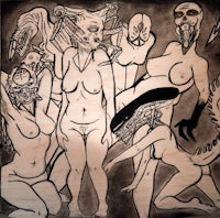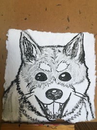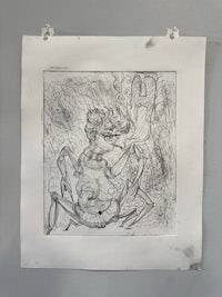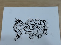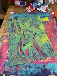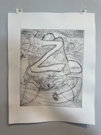 Printmaking: Drypoint etching, linocut, and reverse drawing techniques used to explore mythology, identity, and creature design.