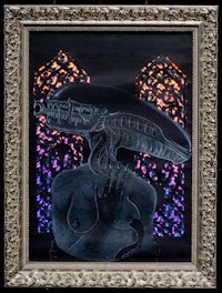 Xenophilia (hallowed be thy name), white charcoal, paper, holographic material, custom frame