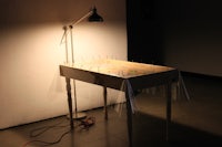 Qurio Operating Table, oil and acrylic corpse painting, wood, plastic vinyl sheet, nails, lamp, extension cord