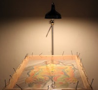 Tulleh, paper, india ink, ink brush, fishing wire, white string lights