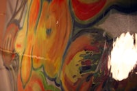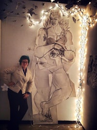 Tulleh: Tulleh is an eleven-foot-tall orc woman radiating vulnerability and sensitivity. She stands against the wall like a glowing sentinel, surrounded by painted flowers suspended from the ceiling with fishing wire. Her scale and tenderness transform the space into a shrine of monstrous femininity — soft, towering, and luminous.